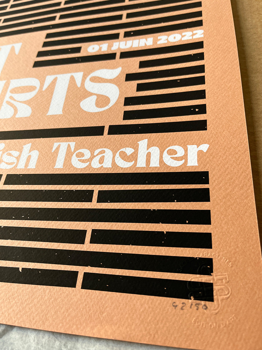 Parquet Courts + English Teacher | Feyzin (Fr) Sérigraphie officielle Concert à l'Épicerie Moderne, juin 2022 Design de l'artiste Sacrés Caractères (Joël Blanc-Tailleur) Edition numérotées et signées de 50 exemplaires Sérigraphie 2... Voir la description complète du produit